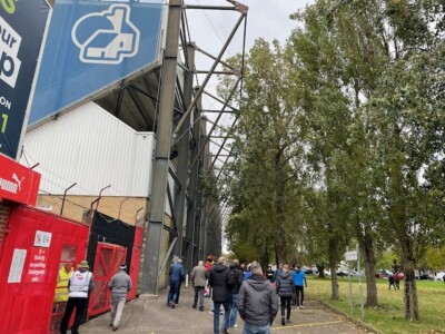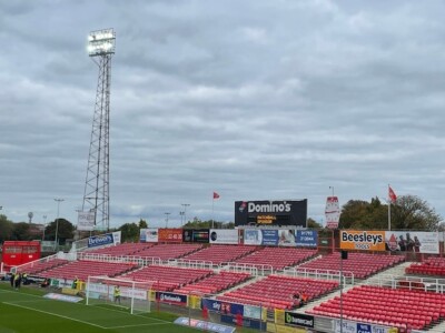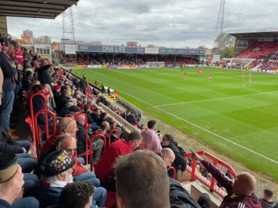 County Ground is a classic old football ground, right down to the giant floodlight towers and 1963 Rolex clock over the uncovered seats in one end – the only Rolex clock in a football ground in the world, they claim. That stand was supposed to get a roof when it replaced an old terrace, but the money ran out. It’s only used for big away…